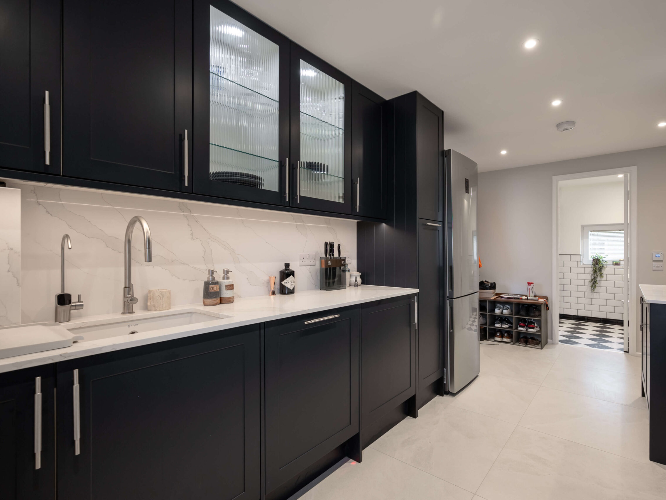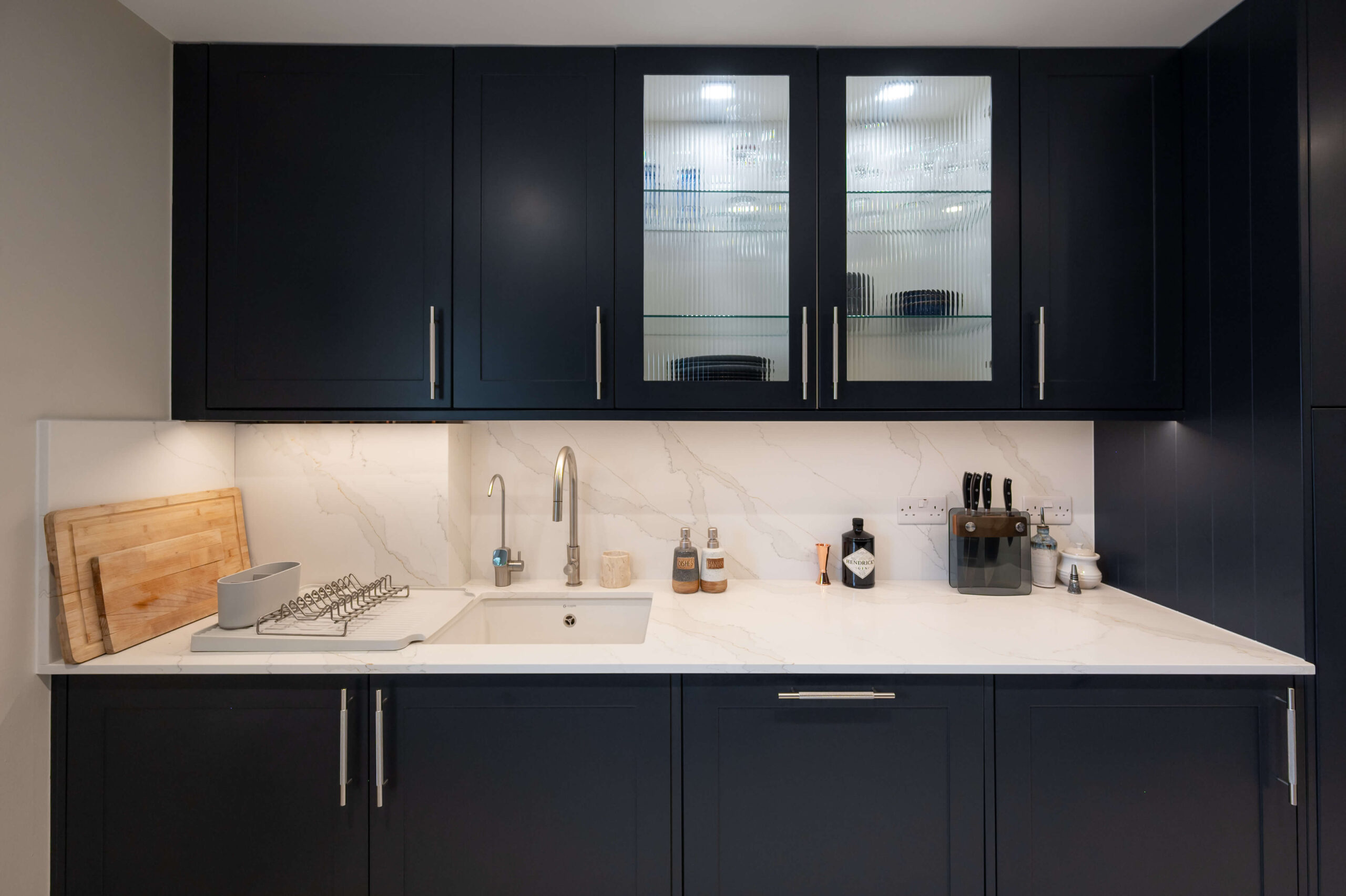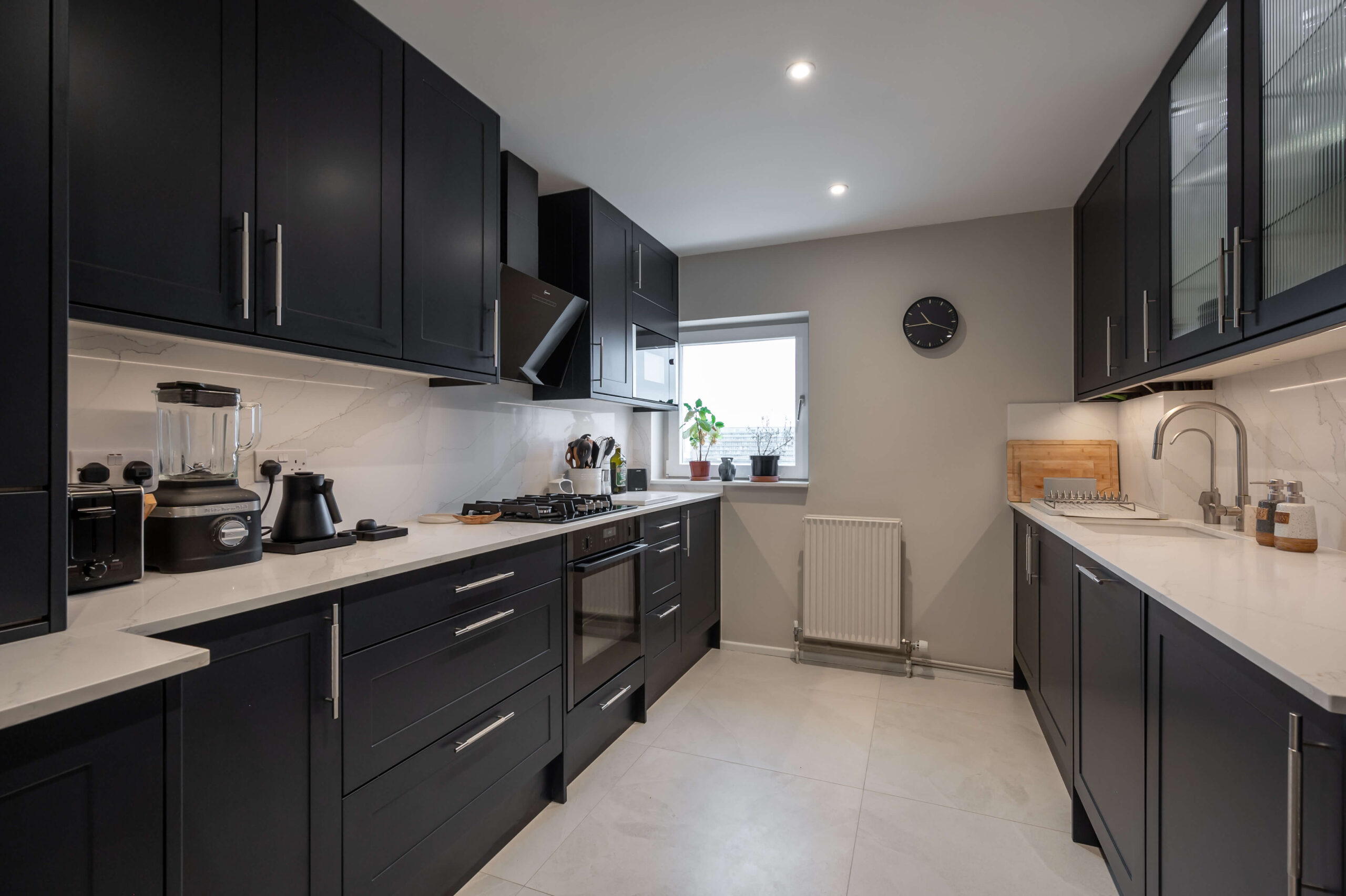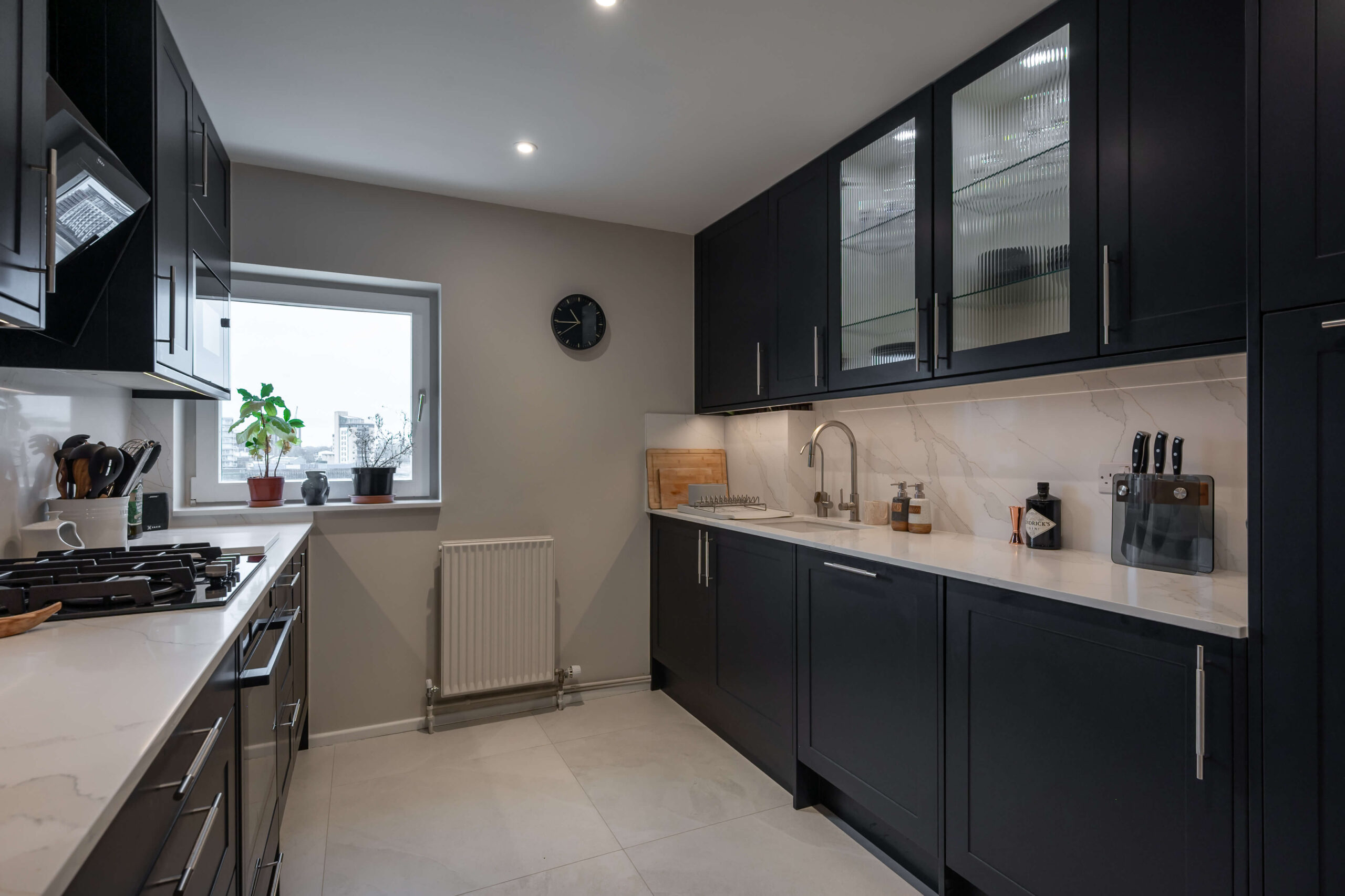 The kitchen was designed as a galley-style layout, making intelligent use of the available footprint to maximise both storage and workflow efficiency. Deep matte cabinetry runs the full length of both walls, creating a bold, confident presence that anchors the entire space. Brushed steel bar handles add a clean, contemporary edge, while reeded glass wall units introduce a subtle decorative detail and allow light to pass through the upper cabinetry. White worktops and a full-height marble-effect splashback run continuously across both runs, keeping the look cohesive and adding brightness to offset the darker cabinetry. Under-cabinet lighting illuminates the worksurfaces beautifully, enhancing both the atmosphere and the practicality of the space during food preparation.