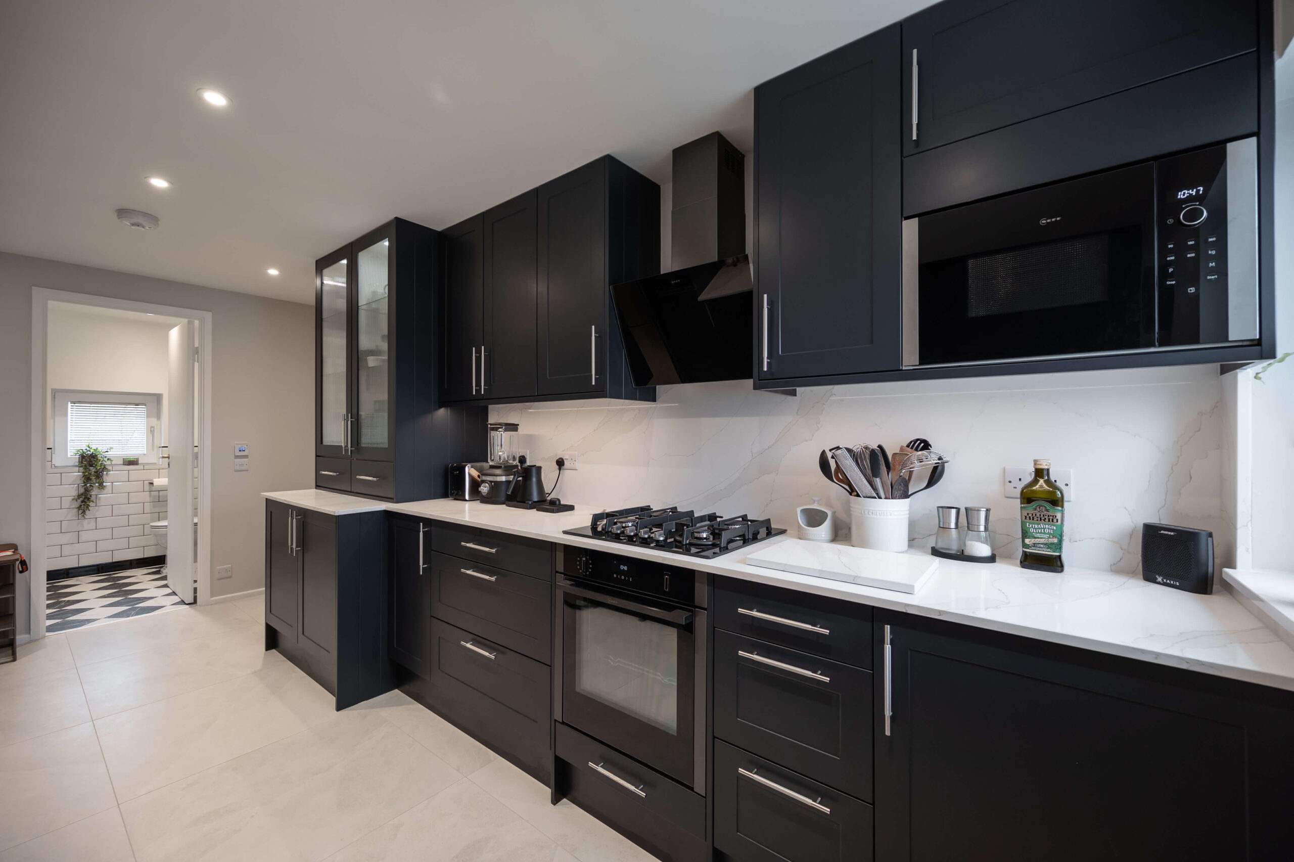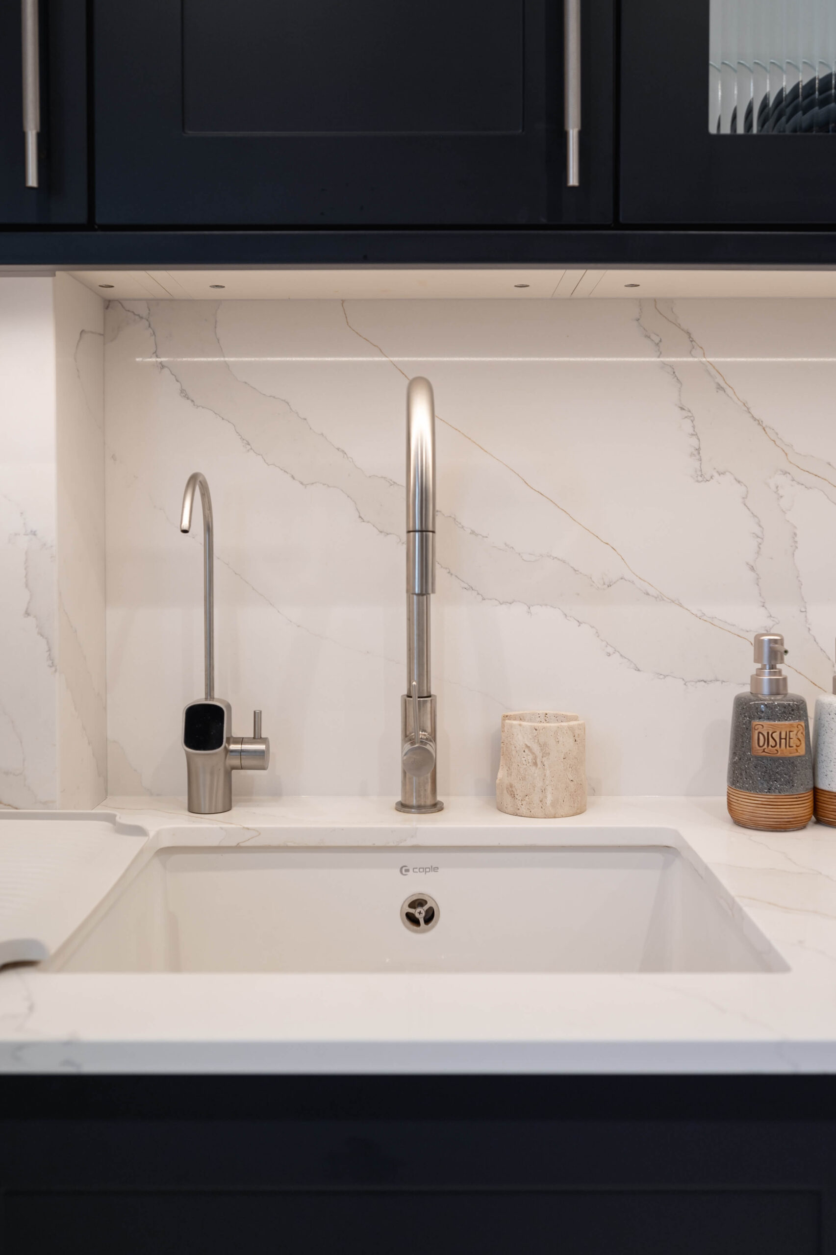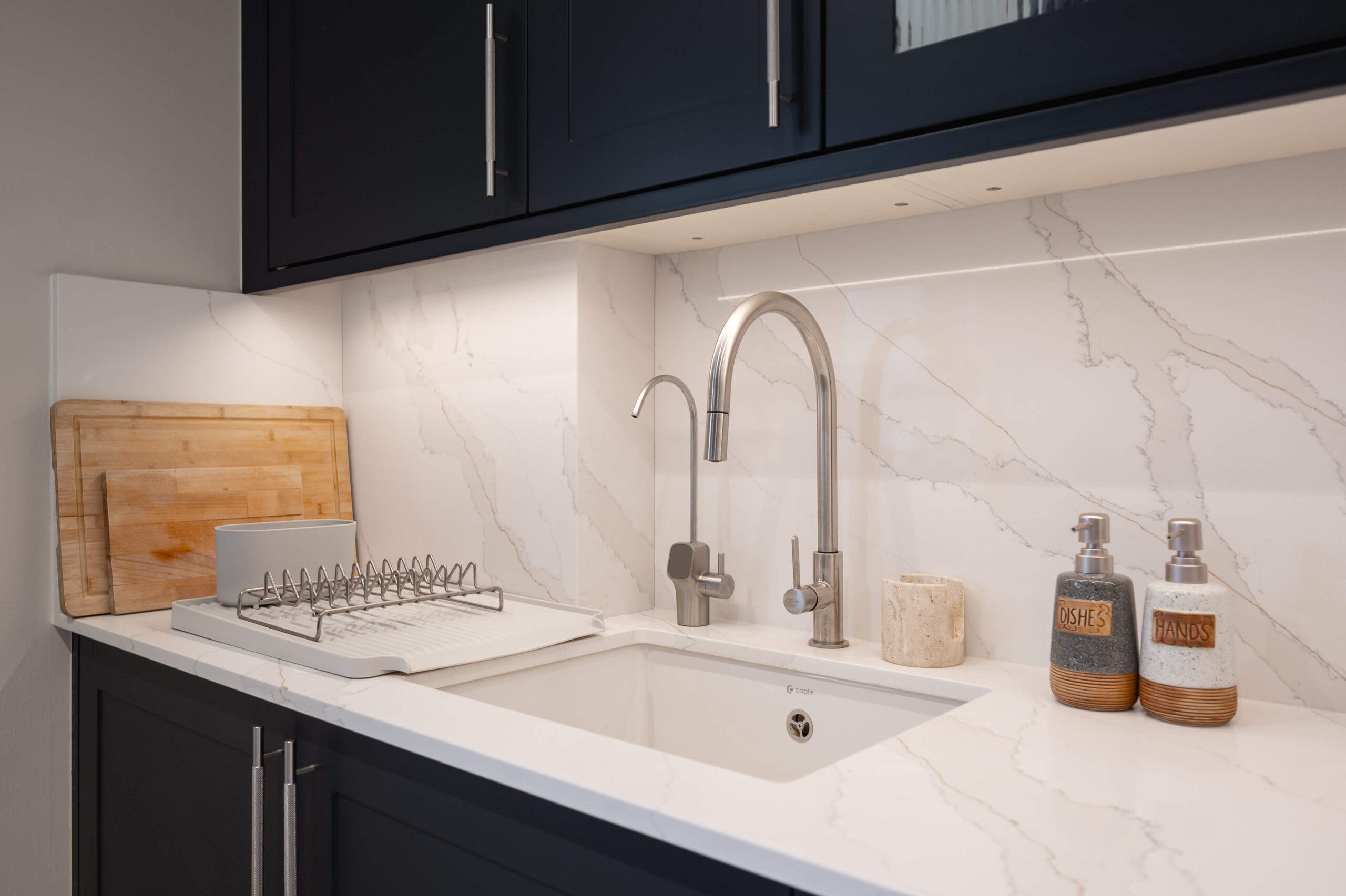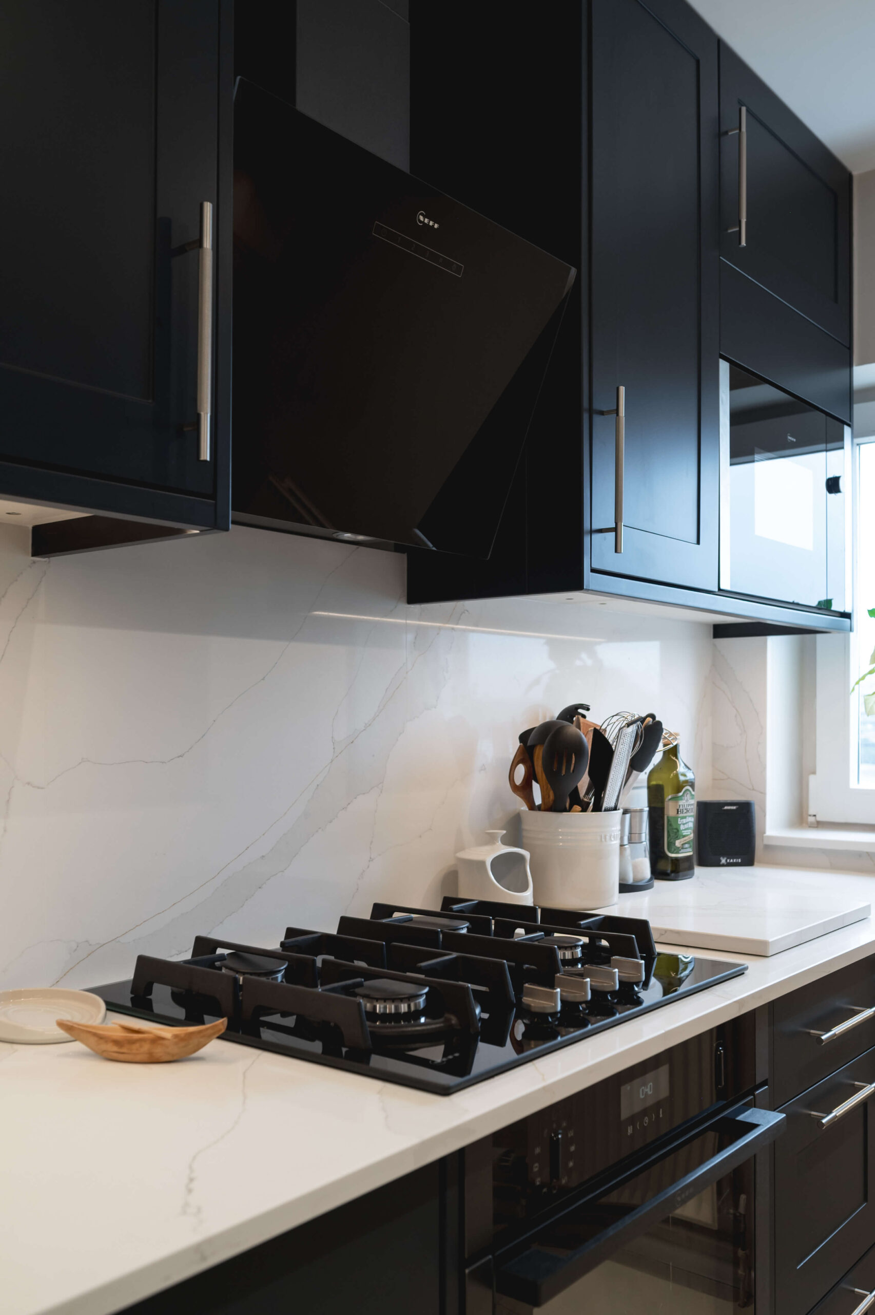 The kitchen was designed as a galley-style layout, making intelligent use of the available footprint to maximise both storage and workflow efficiency. Deep matte cabinetry runs the full length of both walls, creating a bold, confident presence that anchors the entire space. Brushed steel bar handles add a clean, contemporary edge, while reeded glass wall units introduce a subtle decorative detail and allow light to pass through the upper cabinetry. White worktops and a full-height marble-effect splashback run continuously across both runs, keeping the look cohesive and adding brightness to offset the darker cabinetry. Under-cabinet lighting illuminates the worksurfaces beautifully, enhancing both the atmosphere and the practicality of the space during food preparation.